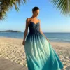 - Color/Print: Gradient ombre transitioning from deep navy at the bodice to turquoise and seafoam at the hem.