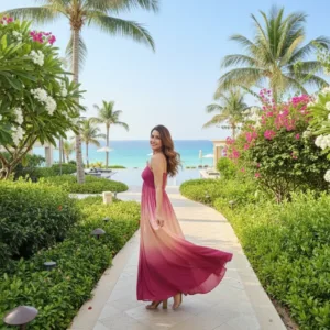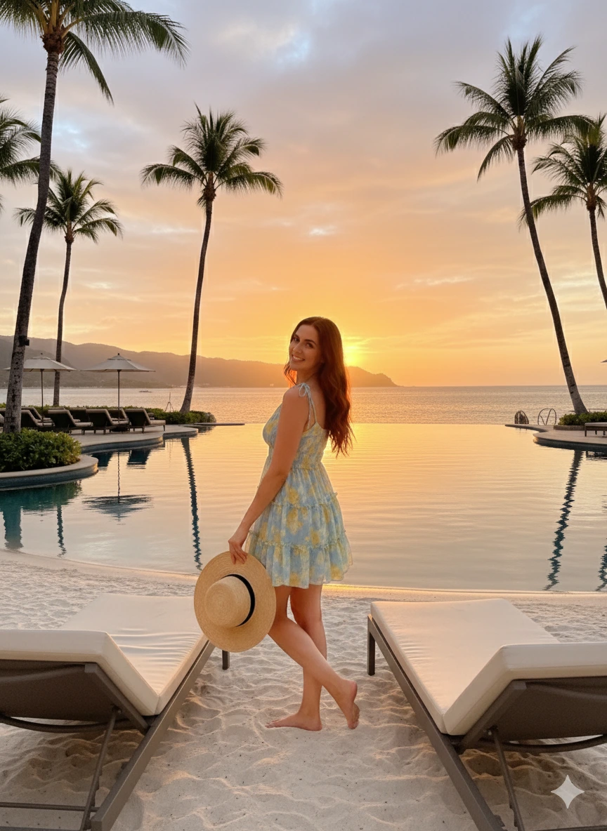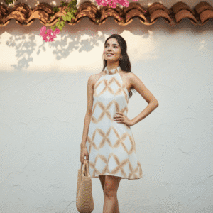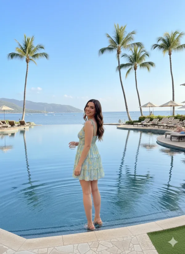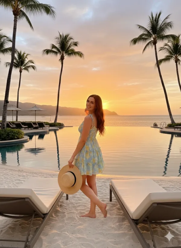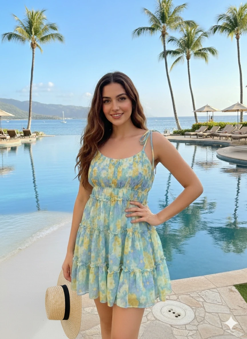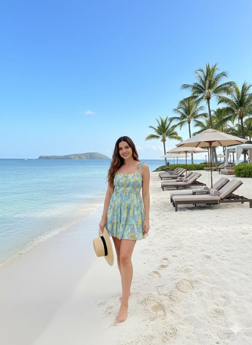 - Styling notes: Pair with straw hat (as shown), sandals or espadrilles, delicate jewelry, and a light tote for a relaxed, sunny vibe.
