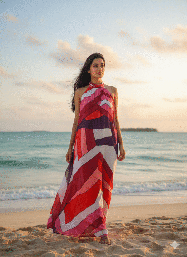 - Neckline: Halter neckline that ties or fastens at the back of the neck