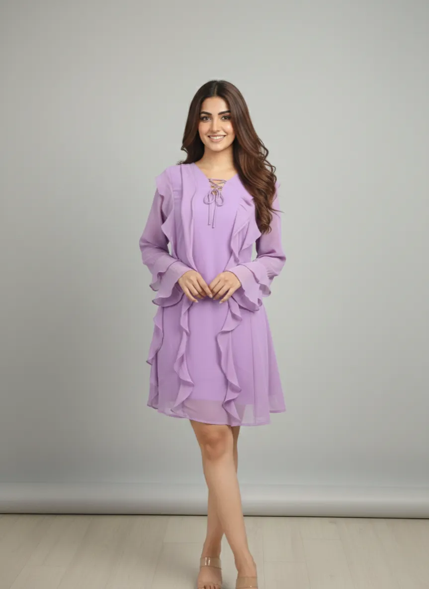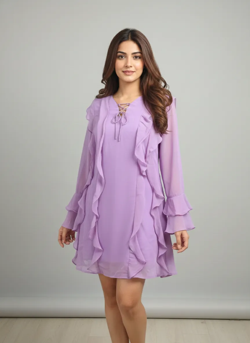 • Neckline & Sleeves: Lace-up round neckline with long ruffle sleeves.