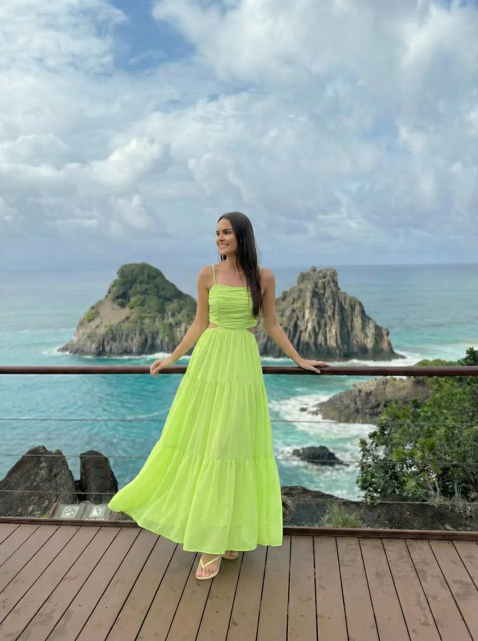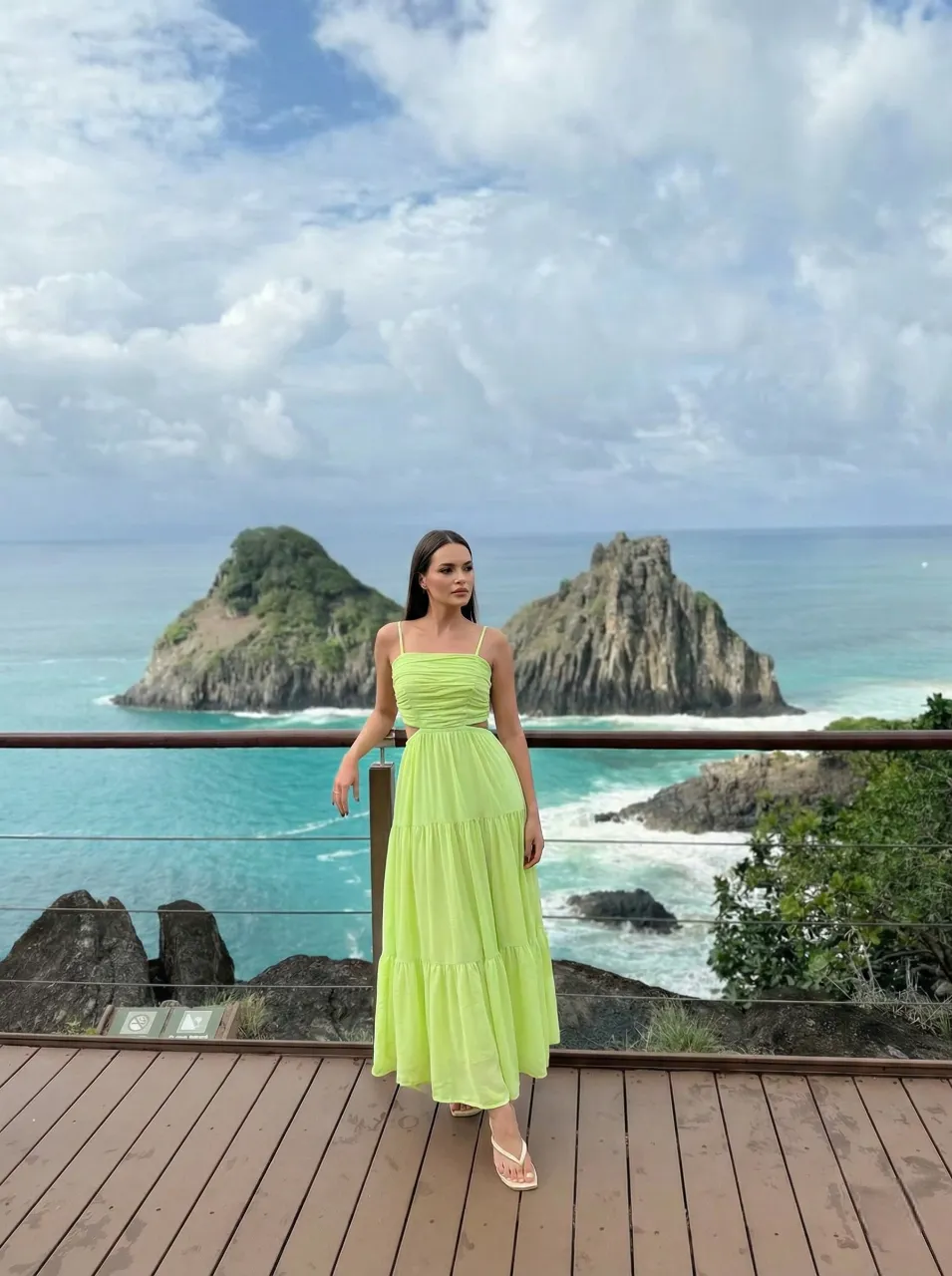 Lime green tiered maxi dress for women designed in breathable chiffon fabric to deliver effortless elegance and graceful movement for tropical vacations and resort styling.