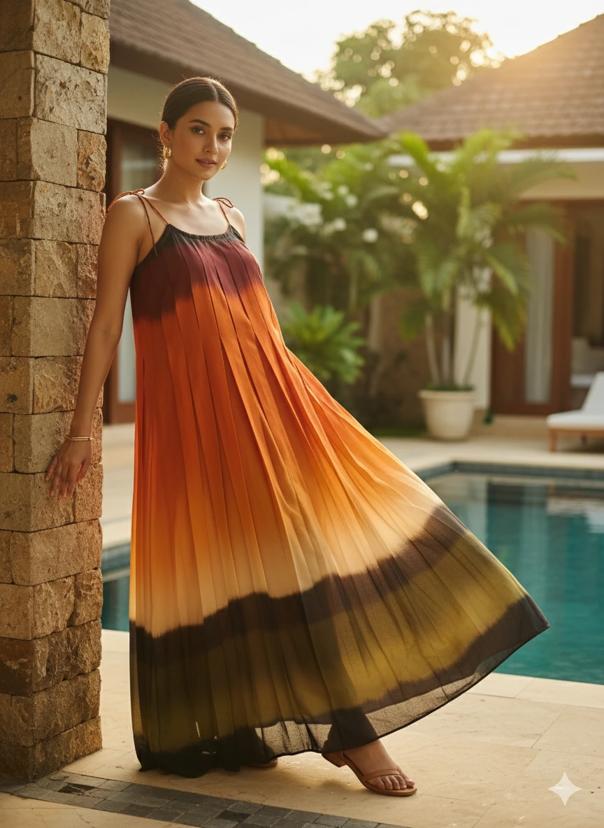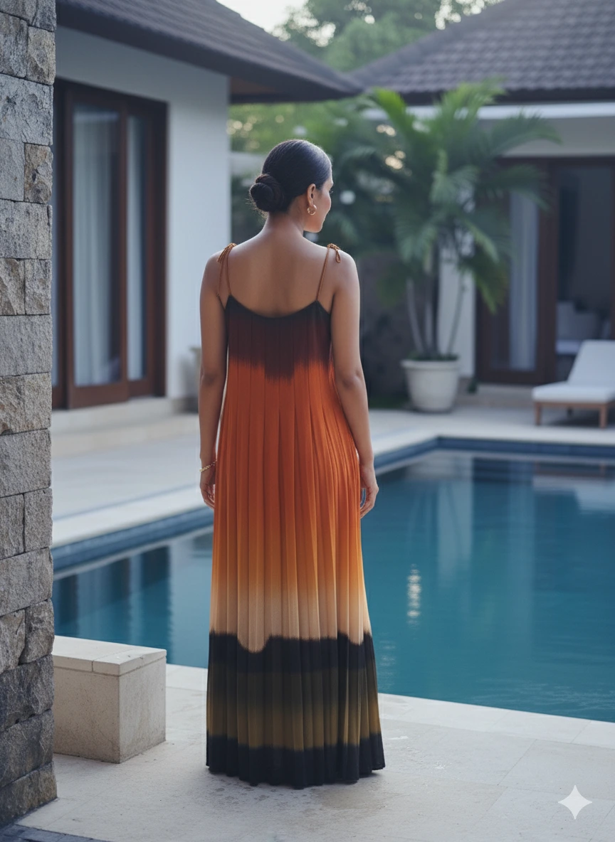 - Colour/Print: Gradient ombre from burnt orange at the bodice to navy at the hem