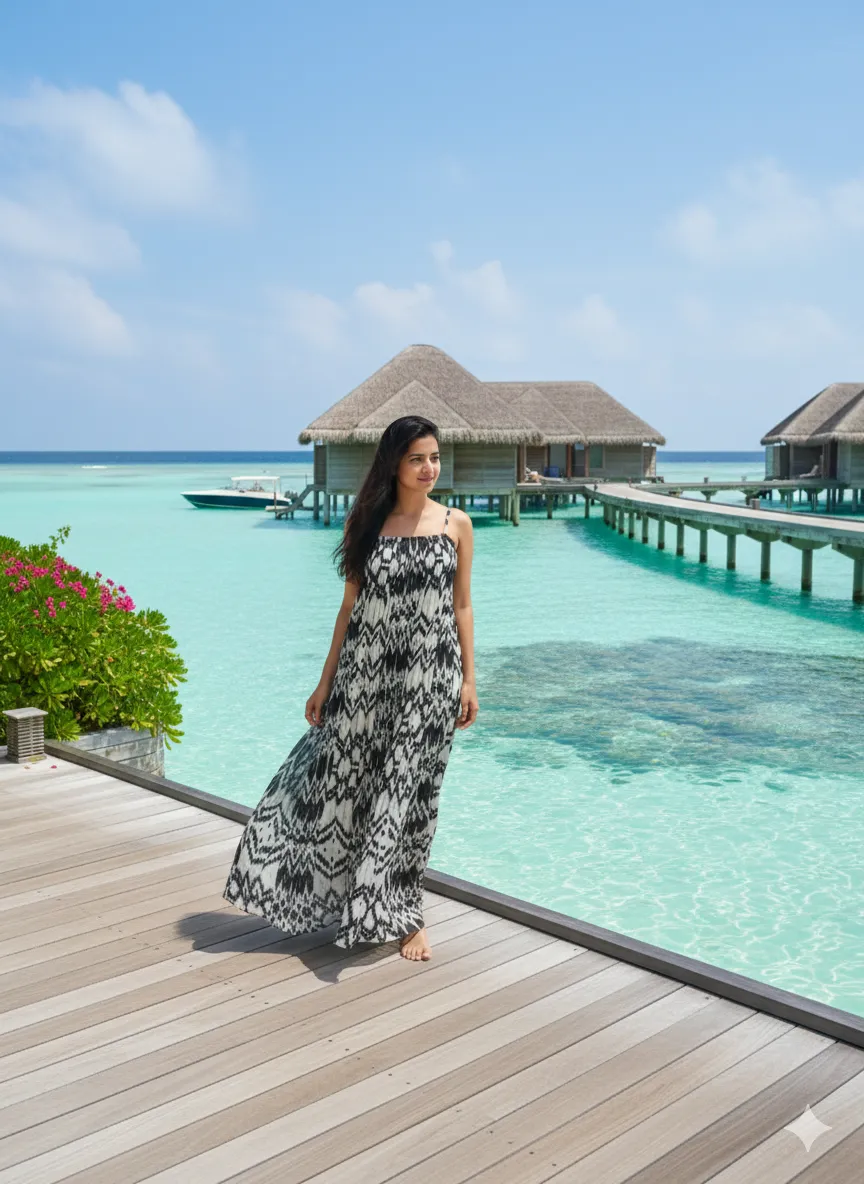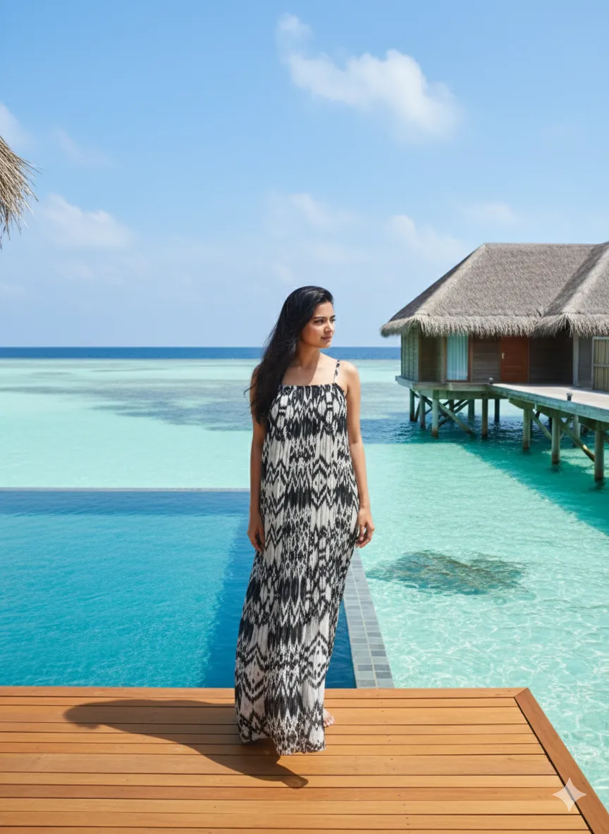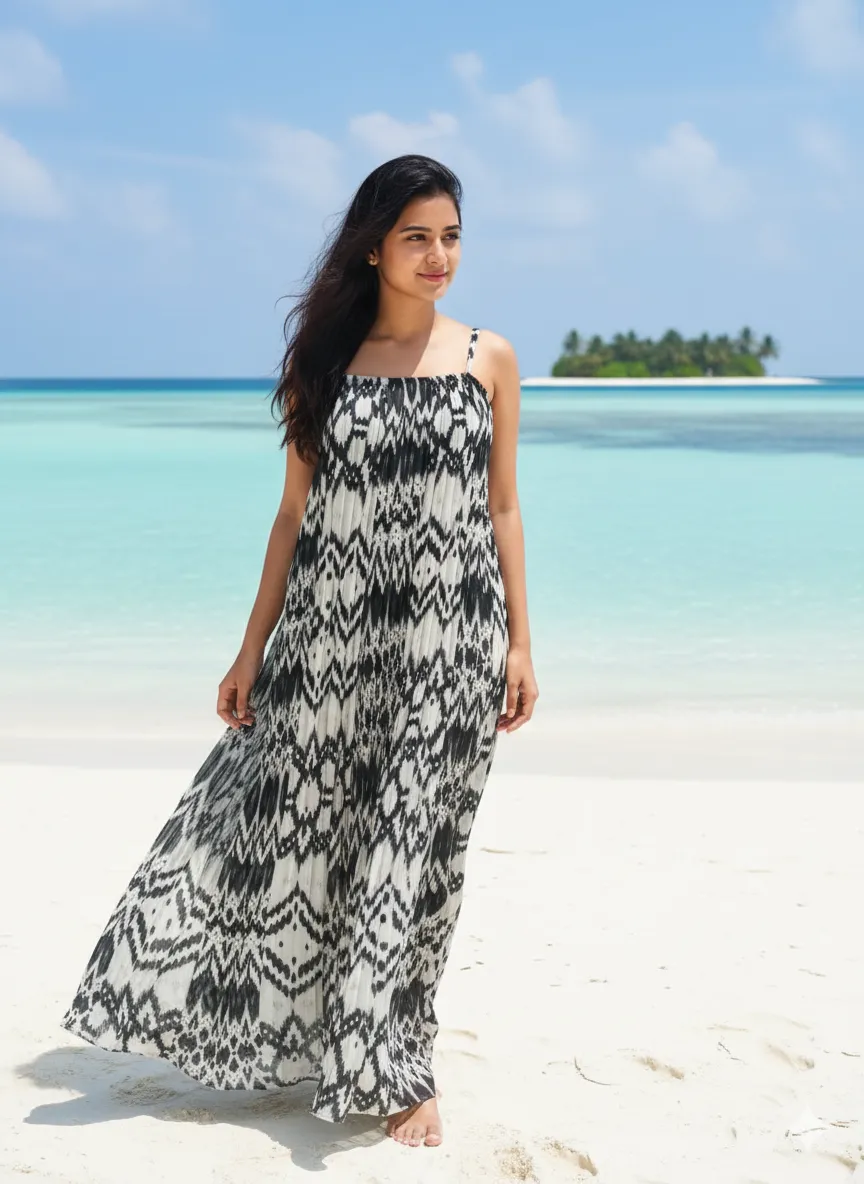 Pleated Ikat Print Maxi Dress for Beach Vacations